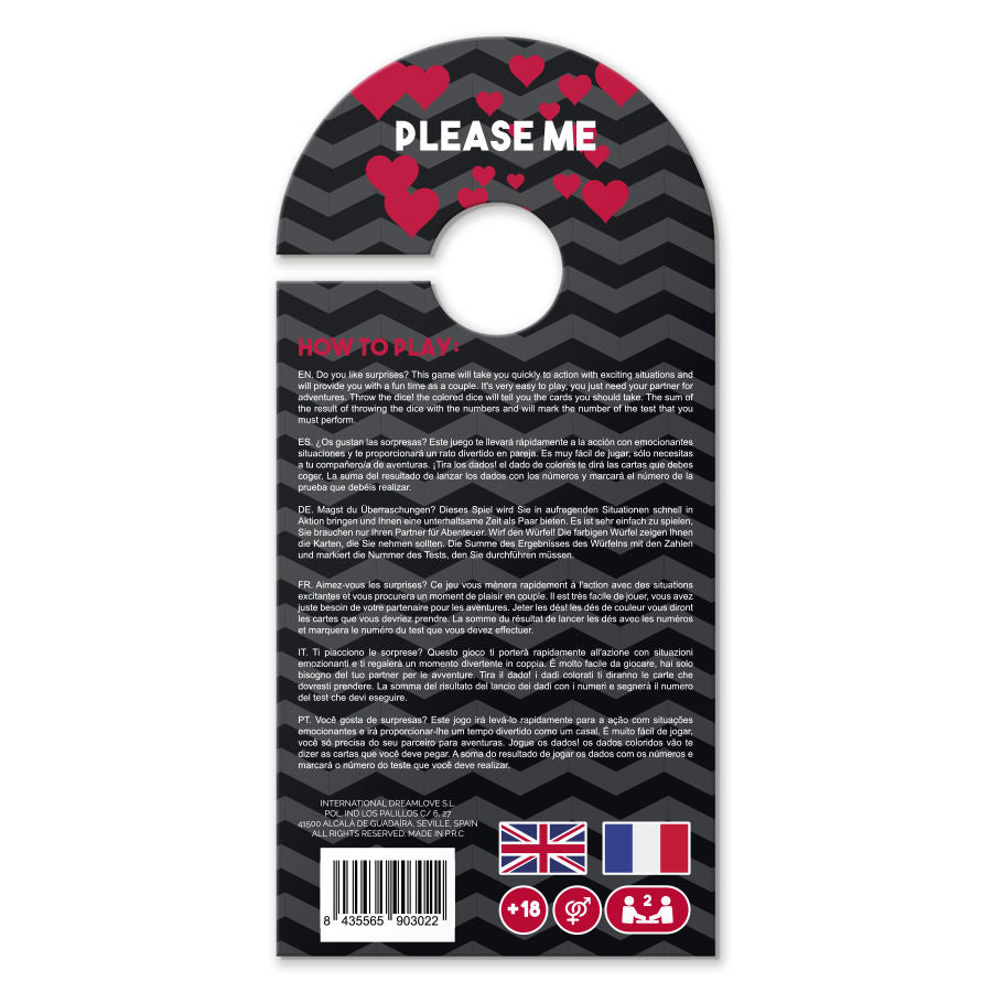 Aimez-vous les surprises? Ce jeu vous amènera rapidement à l'action avec des situations passionnantes et vous offrira un moment de plaisir en couple. C'est très facile à jouer, vous avez juste besoin de votre partenaire d'aventure. Jetez les dés! Les dés colorés vous indiqueront les cartes que vous devez prendre. La somme des résultats de lancer les dés avec les nombres et marquera le numéro du test que vous devez lancer.