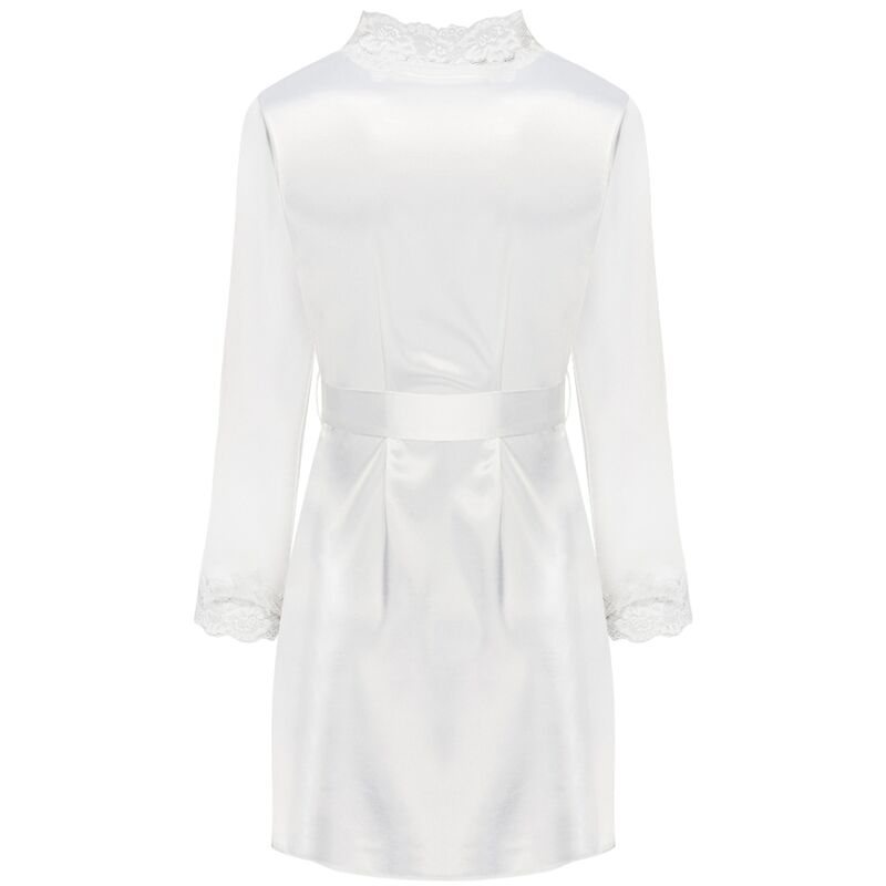 Un ensemble de sous-vêtements d'une beauté exceptionnelle en satin écru brillant, un peignoir et une nuisette, arrivant jusqu'à mi-cuisse. Le devant et les manches longues de la robe de chambre nouées à la taille par une ceinture sont ornés d'une belle dentelle. T-shirt à fines bretelles réglables, orné de la même dentelle au niveau du buste. String inclus.