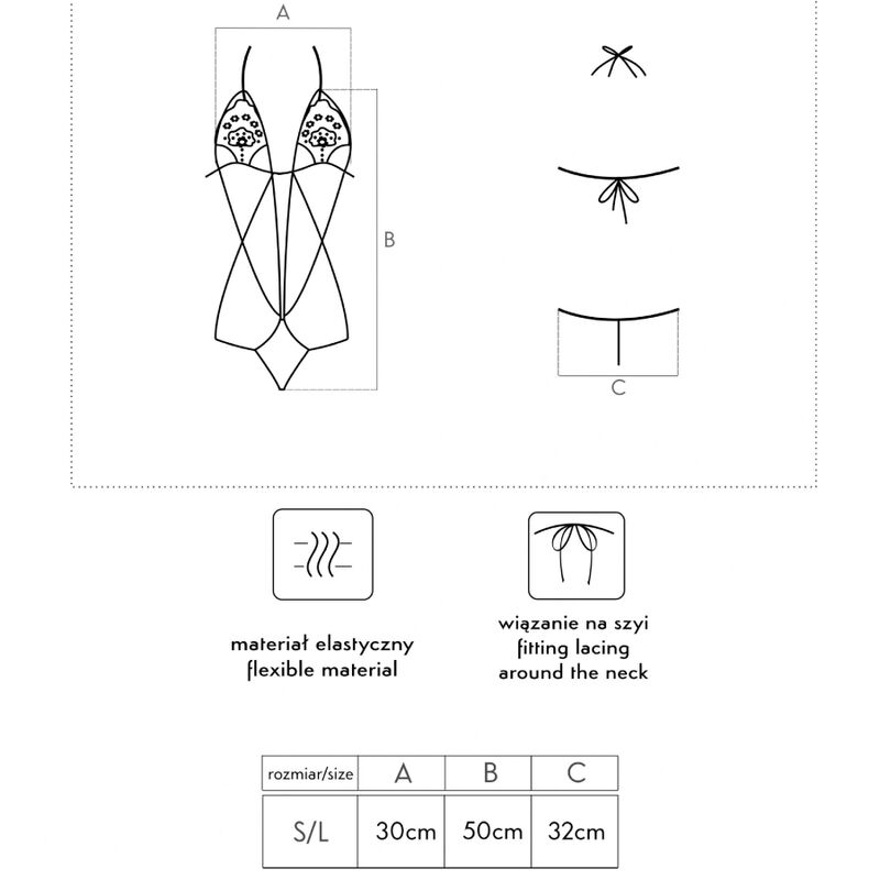 La matière extensible 90% polyamide et 10% élasthanne rend le body agréable au toucher et confortable à porter. Le cordon de serrage réglable au niveau du cou et du dos permet d'ajuster facilement le body, il est donc disponible en taille universelle S/L.