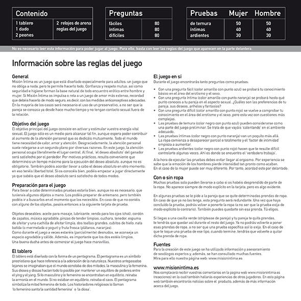 Intimate Mission vous emmène dans un voyage de découverte, où le plus important est de profiter. À travers 480 questions et activités, vous et votre partenaire découvrirez ce qui vous plaît le plus. Le jeu commence par des épreuves affectueuses et romantiques, puis passe par des activités plus intimes, pour enfin arriver aux épreuves les plus passionnées dans lesquelles tout est permis et rien n'est obligatoire. De manière ludique, les barrières sont brisées et vous vous rapprochez les uns des autres. Le jeu est captivant, passionnant, direct et audacieux, parfois hilarant, mais sans jamais perdre le respect et le bon goût. Dans ce jeu, il n'y a aucune obligation et tout peut être fait à votre guise.